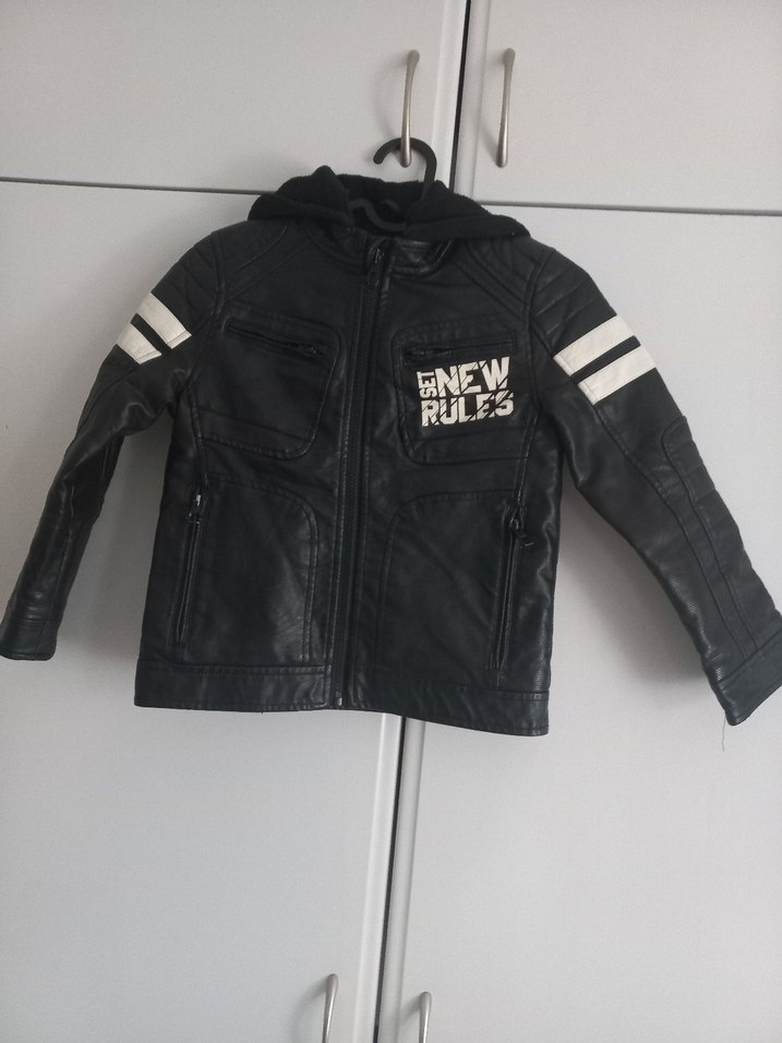 Erkek çocuklar için siyah deri, fitted biker ceket. Kapüşonu çıkarılabilir, montun herhangi bir kusuru yoktur