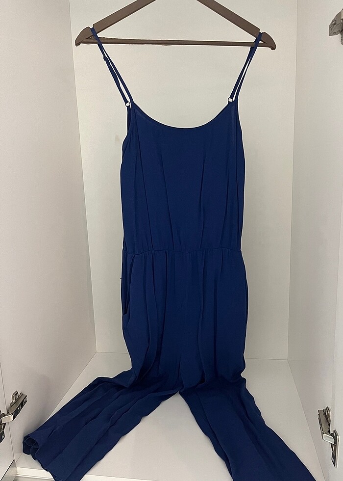 Defacto marka tulum. Saks mavisi, 38 beden. Belden lastikli geniş kesim/salaş, kapri boy. 2 kez giyildi çok iyi durumda