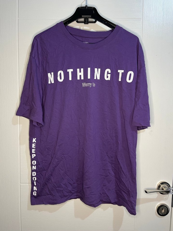Mor renkli, kısa kollu erkek tişörtü, rahat kesim ve yuvarlak yaka ile. Yumuşak sentetik kumaştan, baskılı yazılarla günlük kullanıma uygun şık bir parça. Bedeni xs. Hiç giyilmedi, etiketi yok. Ürünler fotoğraflarda ütüsüzdür, ütülenip gönderilecektir.