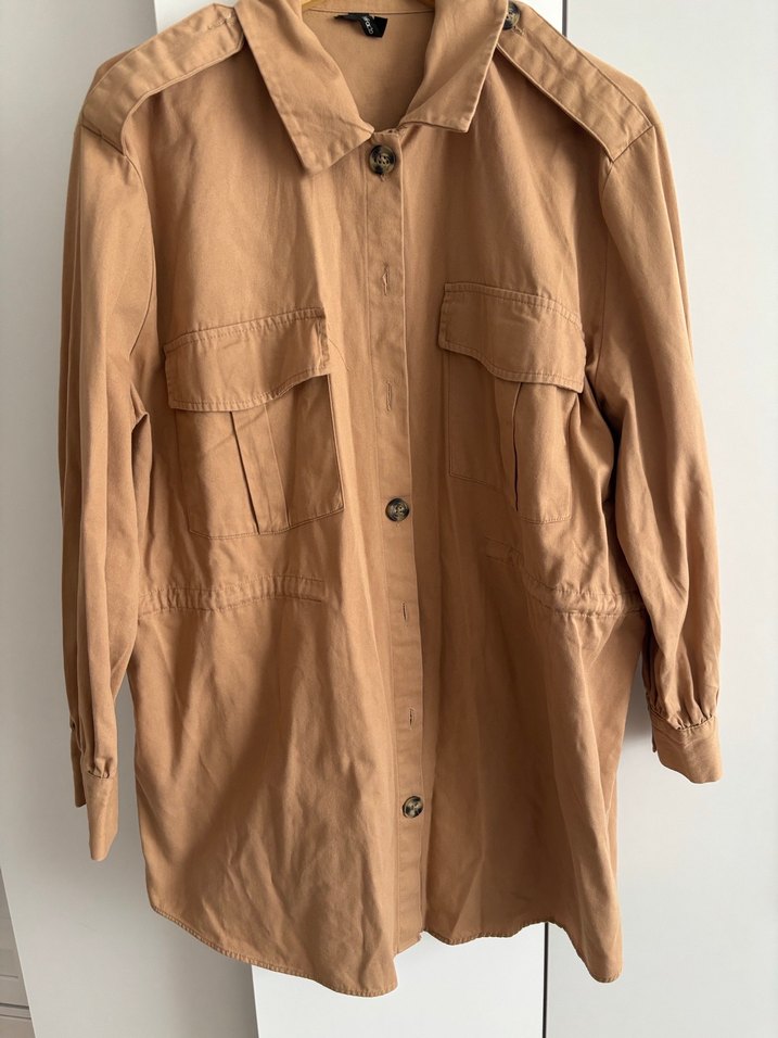 Bej gömlek ceket , uzun kollu ve düğmeli, bol kesim ve kesik yakalı. Günlük sokak stili için uygun. 3XL
