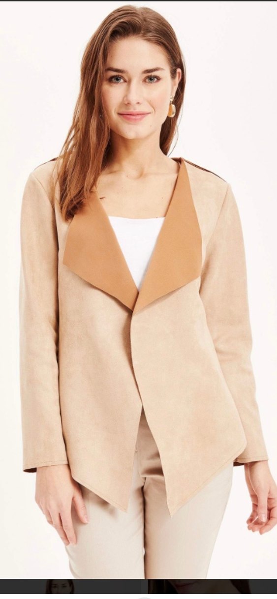 Bej süet ceket , yaka detaylı ön kısmı ile modern, regular fit tasarıma sahiptir. Uzun kollu ve midi boy, ofis için uygundur. Bedeni xl ama çokta bol değil .