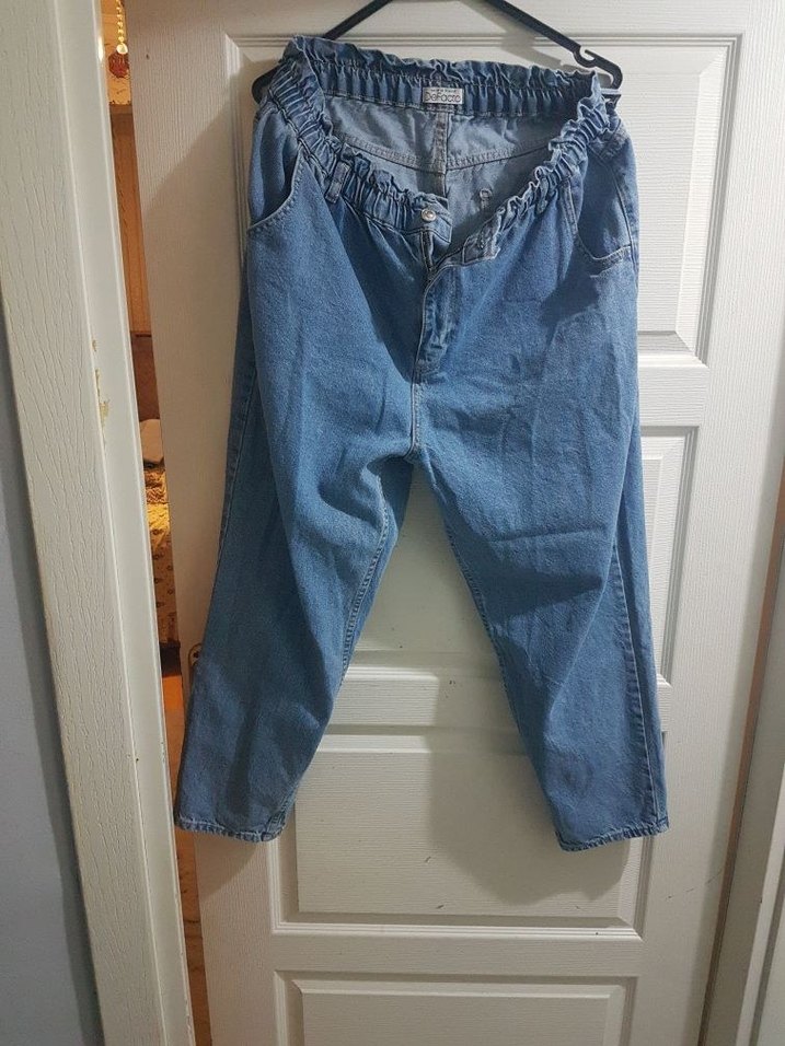 Bu kadın jean pantolonlar, bol kesim ve belden lastikli kemer detayına sahip mavi denim kumaştan üretilmiştir, günlük ve sokak stiline uygundur. 46 beden mom jean