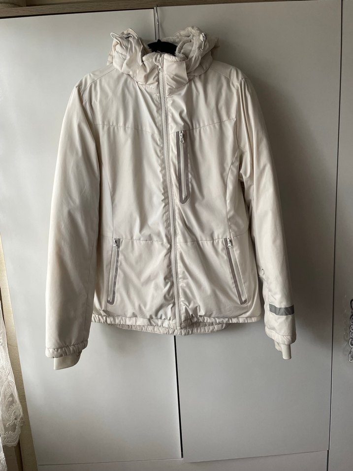 Beyaz renkli, fermuarlı ve uzun kollu kadın mont. Kolunda gizli cebi var. Suya ve rüzgara dayanıklı kumaştan üretildi. Şapkası çıkabiliyor cepleri polarlı. Fermuar kısmında ve el kısmında ufak deformeler var ama göze batmaz.