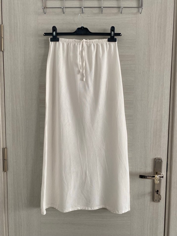 Defacto nun yeni sezon Beyaz keten eteği. bir kez kullandım. Biraz iç gösteriyor ben astarla kullandım. Tarzı çok hoş A kesim. birden fazla beyaz eteğim olduğundan satıyorum