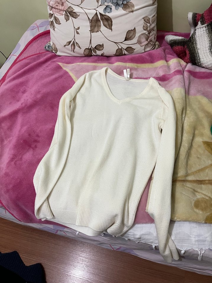 Beyaz pamuklu, uzun kollu ve yuvarlak yaka kazak, rahat ve bol kesimlidir. Desensiz ve normal uzunlukta, günlük kullanıma uygundur. Defactodan geçen sene alınmıştı ama artık giymiyorum ve krem rengi her şeyle uyuşan güzel bir parça hafiften iç gösteriyor