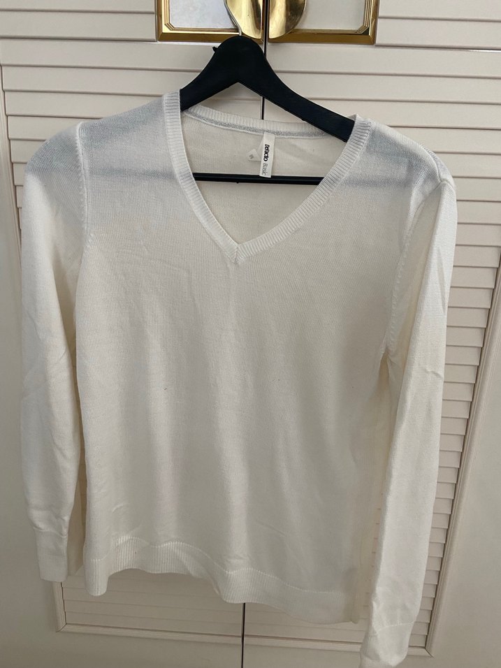 Beyaz V yaka, uzun kollu, kazak. Minimalist günlük kullanım için uygundur. Ürünün dokusu yumuşacık birkaç kez kullanıldı