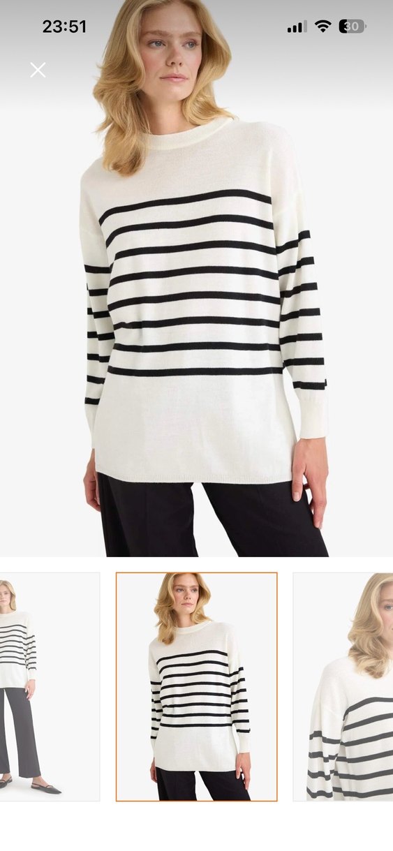 Bu kadın kazağı, uzun kollu ve bisiklet yaka olup, normal kesimdedir. Hafif beyaz örgü kumaştan yapılmış ve siyah yatay çizgilerle süslenmiştir, günlük kullanıma uygun çağdaş bir tarz sunar.
