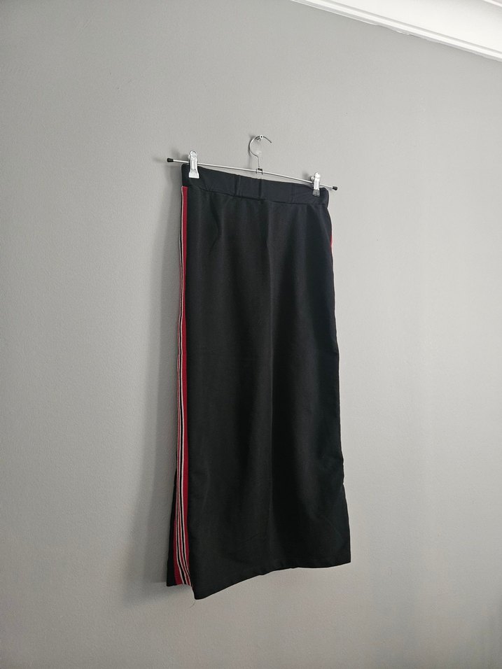 Beli lastikli, yanları çizgili siyah uzun etek, günlük kullanıma uygundur. Bedeni xs görünüyor ancak bel ölçüsünü kontrol etmenizi öneririm. S bedene de olabilir.