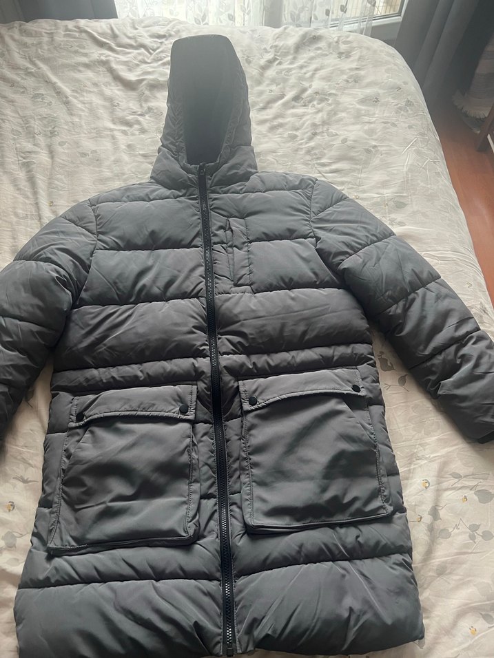 Gri renkli, kapüşonlu ve uzun kollu kadın kışlık mont. Fitted kesim, normal boy ve büyük ön ceplerle günlük kullanıma uygun. ❄️ sağ omzunda küçük bi ip çekilmesi var resimde mevcut