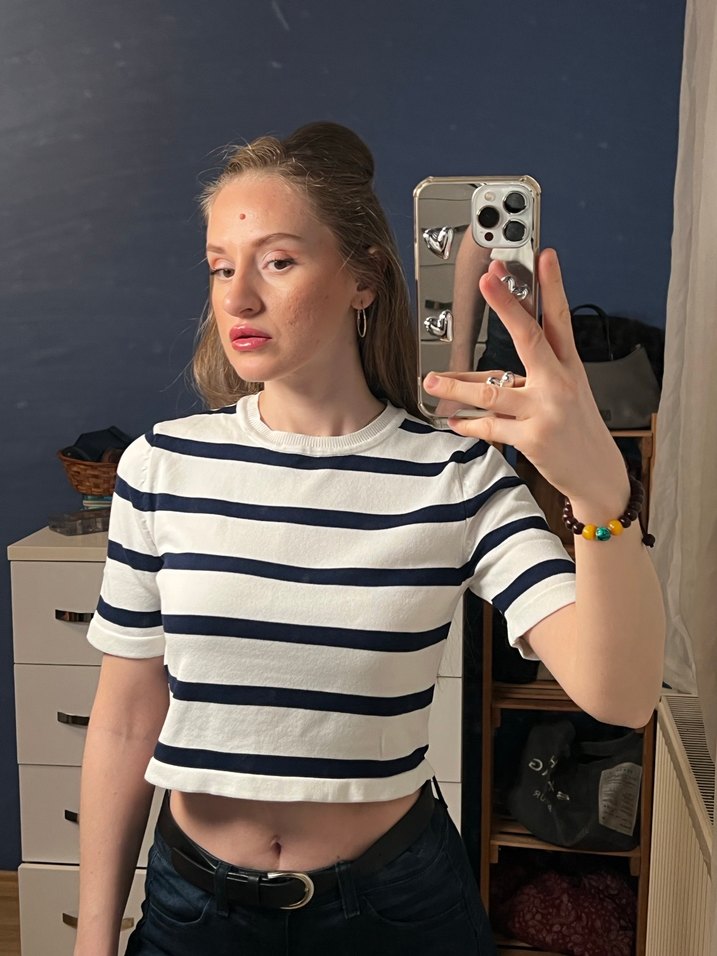 Yumuşak denim kumaştan, kısa kollu ve yüksek yakalı, gri-beyaz çizgili, fitted crop top. Günlük kullanım için rahat ve şık görünüm sunar.