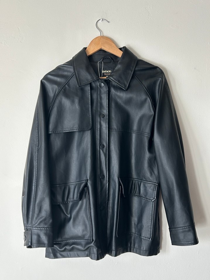 Düğmeli, siyah deri kadın ceket. Notch yaka, normal uzunluk ve regular kesim. Çok az giyilmiştir.