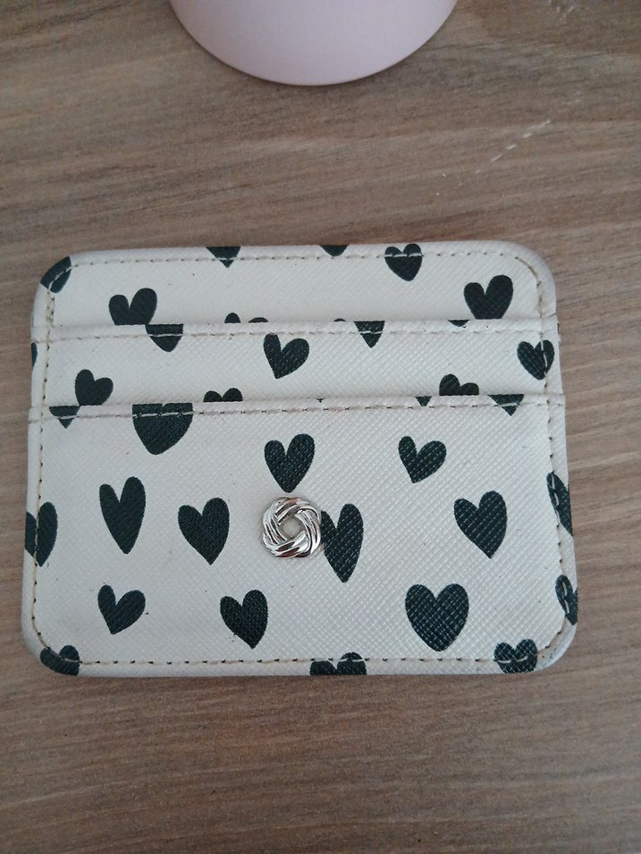 Beyaz deri üzerine siyah kalp desenli, tokalı kadın cüzdan. Çok beğenerek almıştım ancak artık kullanmıyorum