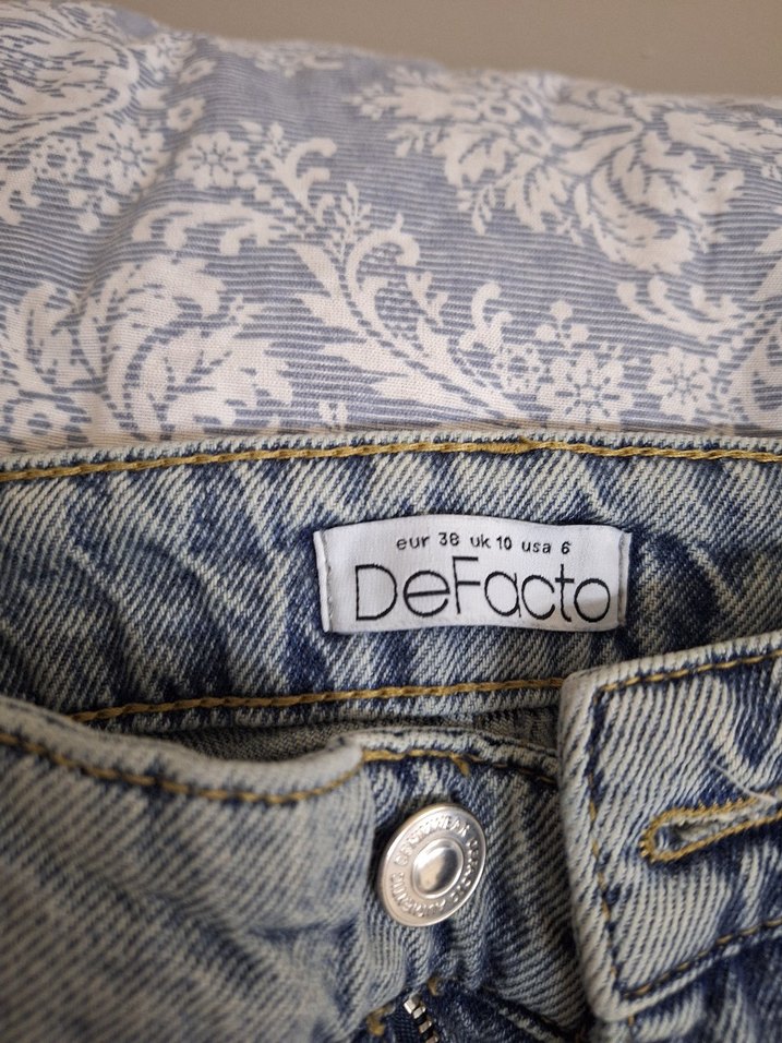 DeFacto markalı, düğmeli, geniş kesim mini jean. Mavi ve gri batik desenli, günlük rahat sokak stili için uygun. baggy pantalon 38 bedendir