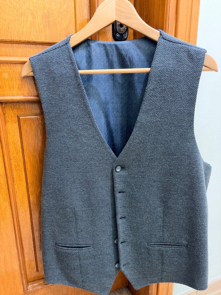 Gri düğmeli ve kruvaze yaka detaylı, normal uzunlukta ve regular fit kesime sahip yelek. Ofis kullanımı için uygundur.