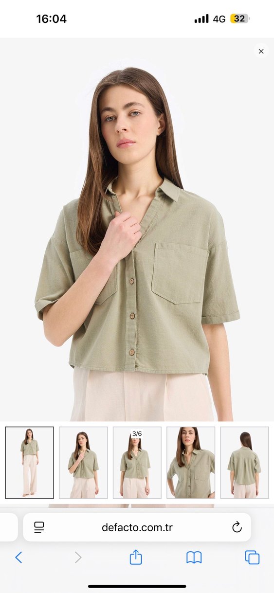 Düğmeli, kısa kollu, keten kumaştan yapılmış, bol kesim ve kısa boyda, yakalı khaki gömlek. Günlük kullanıma uygun bohem tarzda.