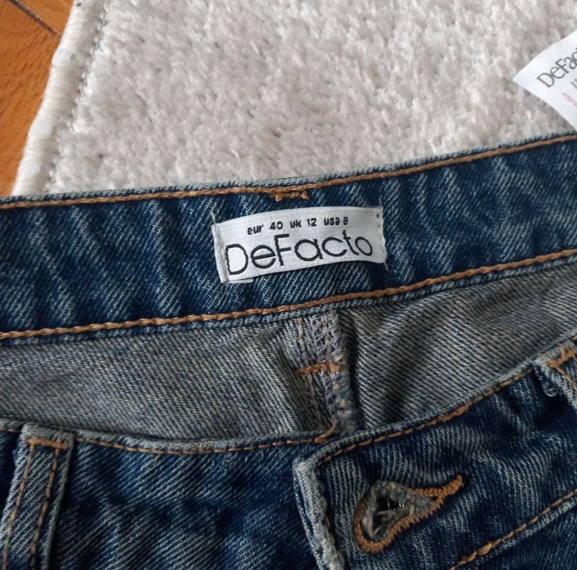 DeFacto markalı, düğmeli, normal boy, fitted kesim, baskılı mavi kot pantolon. Rahat ve şık, günlük kullanıma uygun.