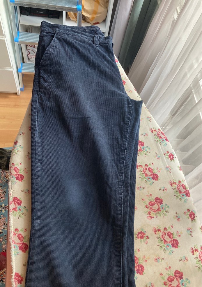 Erkekler için düğmeli, regular fit kesime sahip, normcore tarzında lacivert kadife pantolon. Günlük kullanıma uygundur.