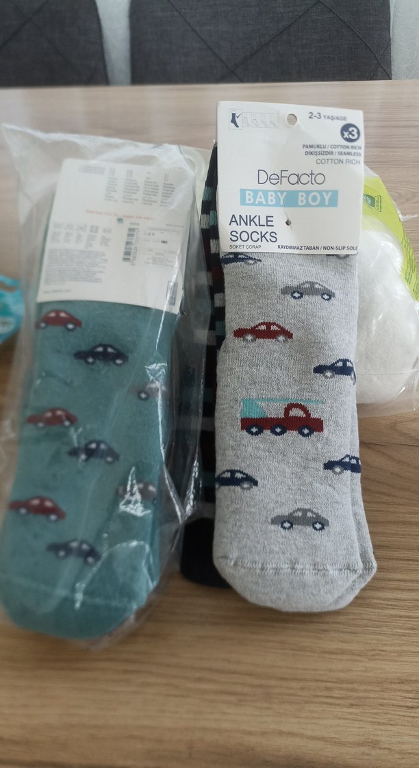 DeFacto erkek bebek için gri, renkli araba desenli bilek çoraplar. Pamuklu yumuşak kumaştan, kaymaz tabanlıdır. 2 3 yaştır fakat 4 5 yaşa da uygundur.