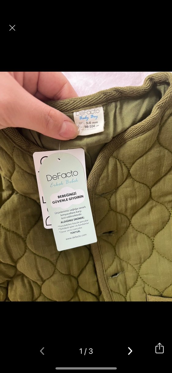 DeFacto markalı, 3-4 yaş (98-104 cm) erkek bebek için khaki renkli, kapitone desenli hırka. Bakım talimatları etiketi mevcuttur. Sıfır ürün