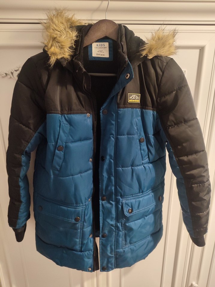11-12 yaş.Kürklü kapüşonlu,erkek çocuk montu. Koyu ve mavi renklerde, baskılı desene sahip. Rahat ve sıcak kumaştan, sokak stili için uygun.