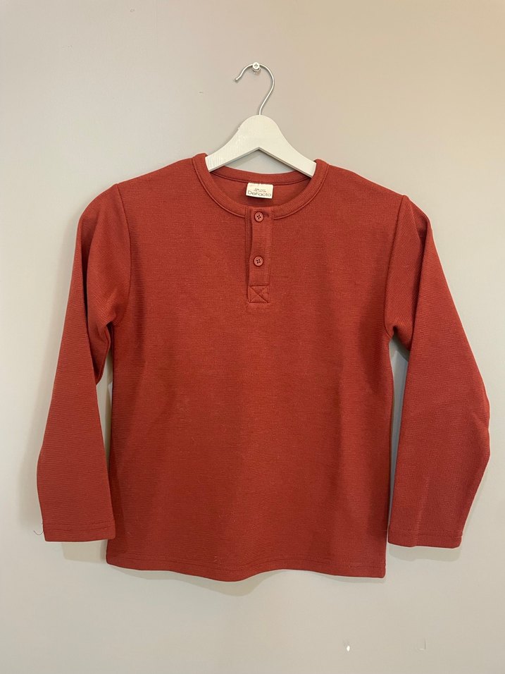 Erkek çocuklar için uzun kollu, düğmeli ve yuvarlak yaka tişört. Pamuk kumaştan, koyu kahverengi renkte, rahat kesim ve sade sokak stiliyle.
