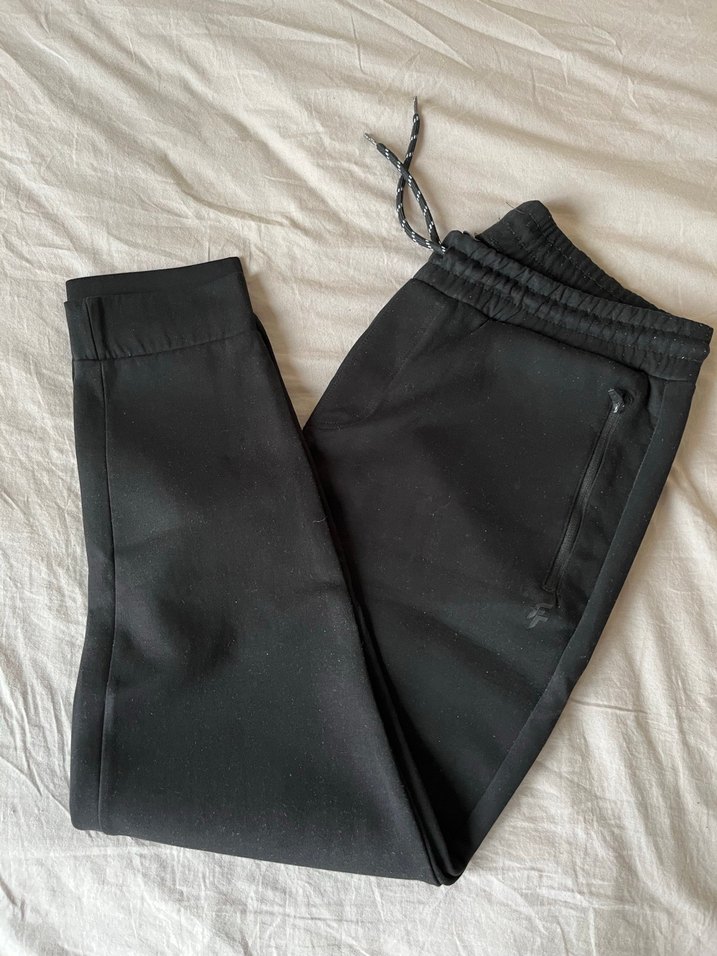 Siyah, sentetik kumaştan fermuarlı cepli, slim fit erkek eşofman. Midi boyda, günlük kullanıma uygun sokak stili.