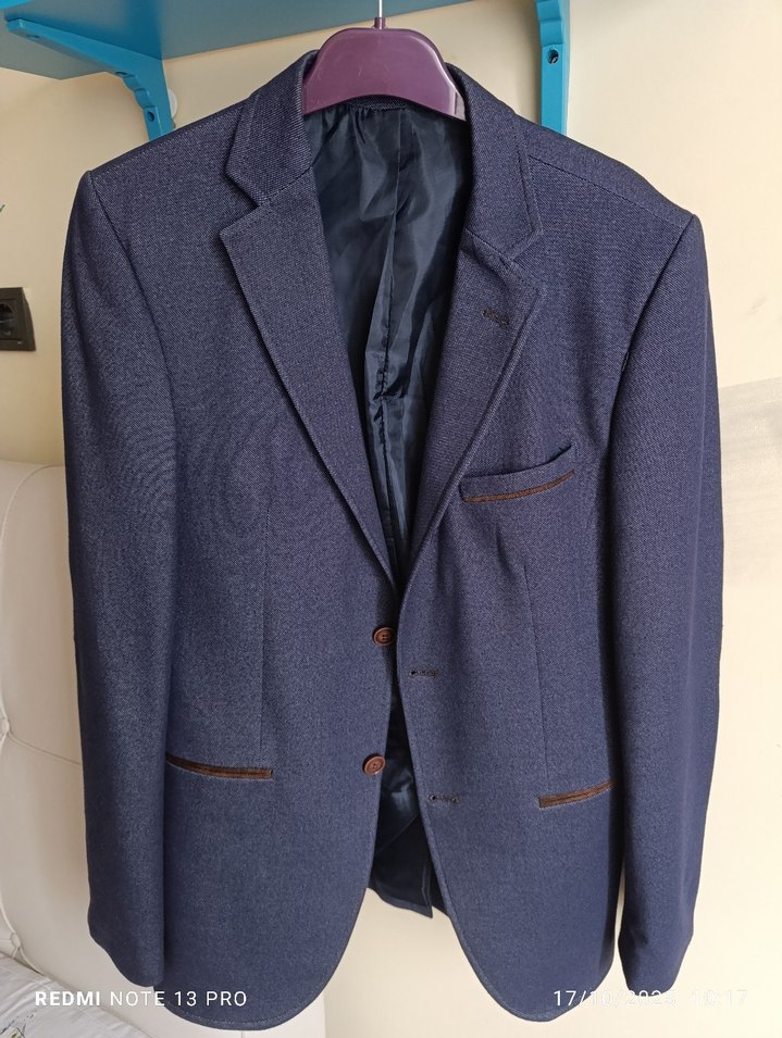 1-2 kez anca kullanıldı. üste oturan kalıp ve çok şık duruyor. Lacivert, düğmeli, normal boyda, çentikli yaka ve uzun kollu klasik kesim ceket. Ofis ve günlük sokak tarzına uygun.