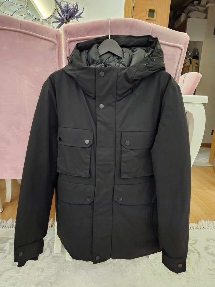 Siyah renkli, düğmeli ve kapüşonlu erkek mont. Normal uzunlukta, uzun kollu ve rahat kesimdir. Yumuşak ve sıcak kumaştan üretilmiştir. Sokak stili için uygun. Tam soğuk havalar için uygun şık bir mont