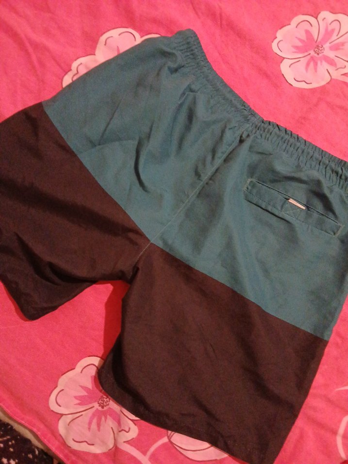 Kemerli bel ve iki tonlu koyu kahverengi ve yeşil renklerle erkekler için bol kesim midi boy yüzme şortu. Plaj ve sokak stiline uygundur