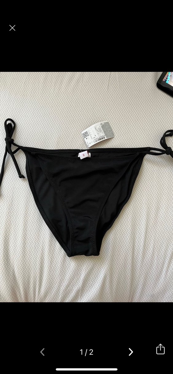 Bu siyah bikini altı, ayarlanabilir yan bağcıkları ve vücuda oturan kesimiyle sahilde cesur ve zahmetsiz şıklık sunar. Normal boyda ve desensizdir. hiç kullanılmadı