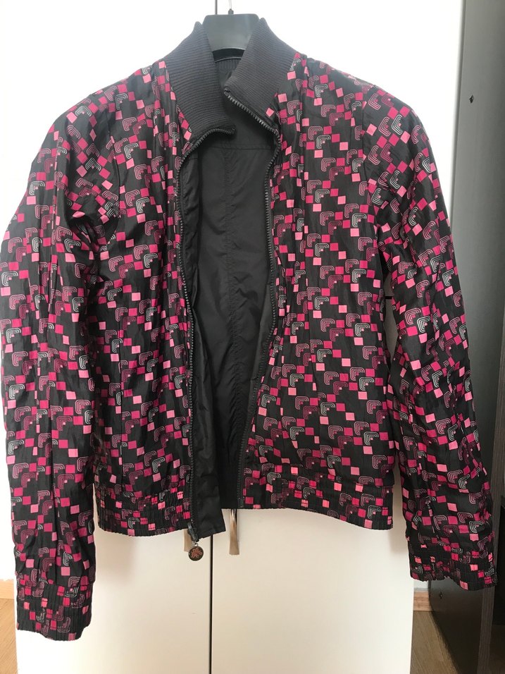 Fermuarlı, notched lapel yaka detaylı, pembe tonlarında pixel desenli, sentetik kumaştan, uzun kollu ve midi boyda, fitted kesim kadın ceket. Ürün çift taraflı olarak kullanılabilmektedir.