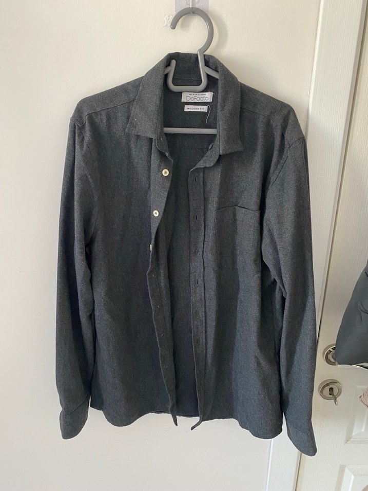 Gri renkli, İnce Yün kumaştan yapılmış, düğmeli ve normal kesim erkek gömlek. uzun kolludur, günlük kullanıma uygundur. M beden
