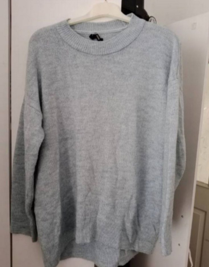 Kadınlar için gri renkli, uzun kollu, yuvarlak yaka ve örgü yapıda yün kazak. Rahat kesim ve midi boyda, gündelik ve konforlu kullanım için uygun.
