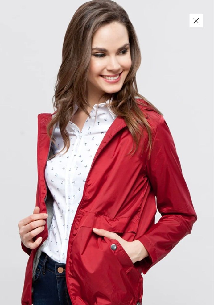 DeFacto markalı gri ve kırmızı renklerde, fermuarlı, bisiklet yaka ve uzun kollu yağmurluk Yumuşak ve sıcak tutan polar kumaştan, bol kesim ve midi boyda, günlük sokak stili için uygun.