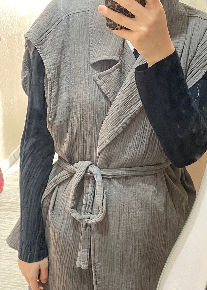 Gri müslin kuşaklı yelek Sadece 2 kez giydim temiz kusuru yoktur 36 38 bedenlere uygundur