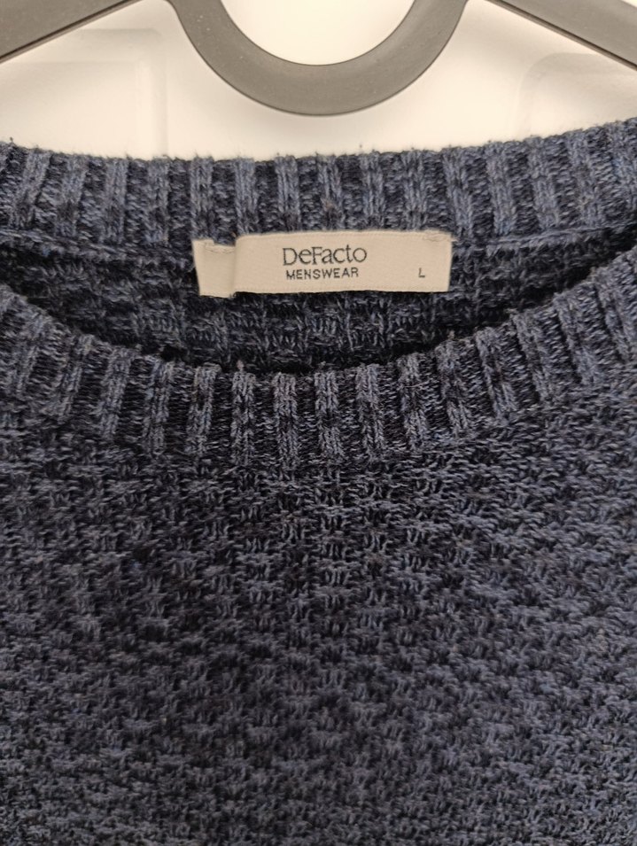 DeFacto gri örgü erkek kazak, yuvarlak yaka ve uzun kollu, bol kesimlidir. Normal midi boyunda, baskılı desene sahiptir.