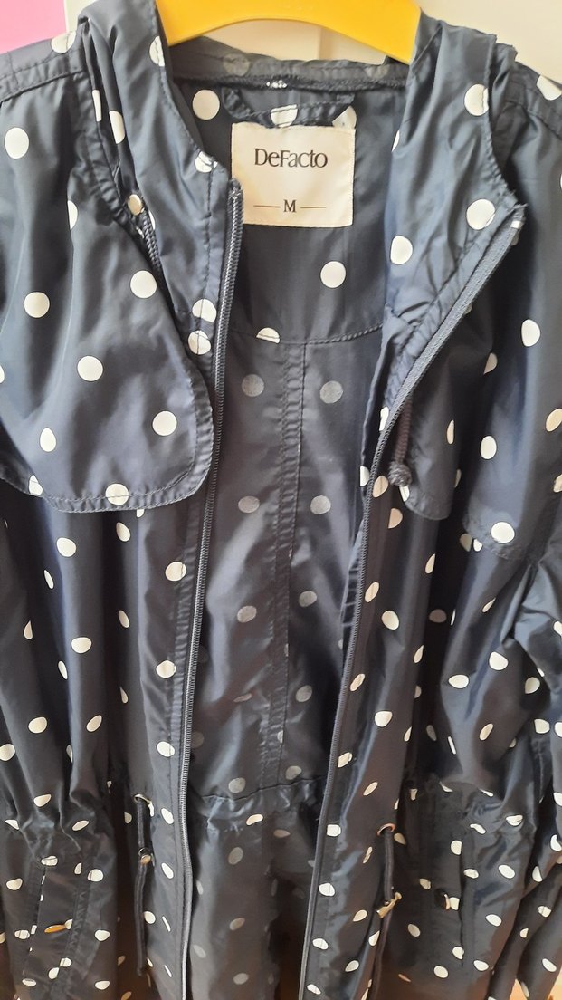 DeFacto marka, gri puantiyeli, uzun ve düğmeli, bol kesim yağmurluk. Notch yaka ve uzun kollu, sokak modasına uygun.