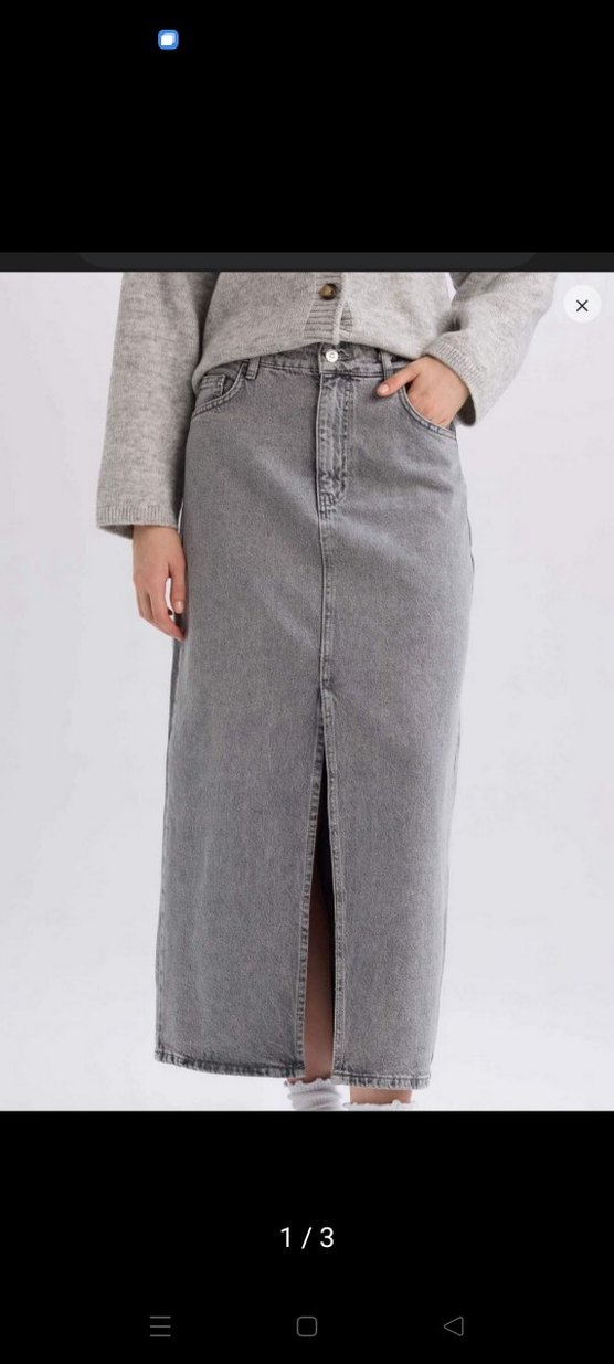 Gri uzun kot etek, bol kesim ve ön yırtmaç detayına sahiptir. Günlük kullanıma uygun, sade ve rahat bir şıklık sunar.