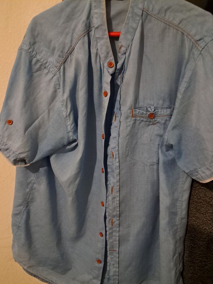 Marka: DeFacto Beden: Large (L) Model: Hakim Yaka (Yakasız), kısa kollu, tek cepli. Kumaş: Keten görünümlü/dokulu, terletmeyen, ince yazlık kumaş. Renk: Açık Mavi (Turuncu dikiş detaylı). Durum Analizi:Ürün kullanılmıştır, yırtık veya sökük yoktur. Kondisyon Notu: Fotoğraflarda yaka detayını görebilirsiniz.Kumaşı çok rahattır, sıcak havalar için idealdir.