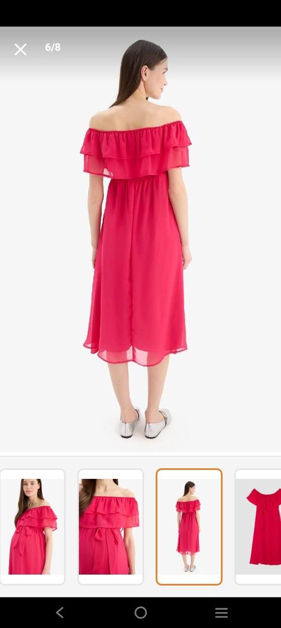fuşya renk, straplez ve volan detaylı midi boy, bol kesim elbisedir. hamilelikte giyindim 3 kere