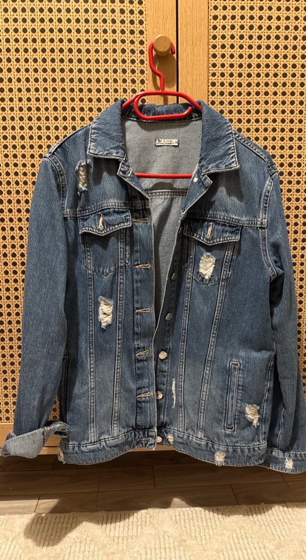 Düğmeli, uzun kollu, bol kesim mavi denim ceket. Yıpranmış detaylara sahip, normal midi boy, günlük kullanıma uygun.