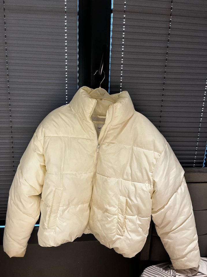 Kadınlar için yüksek yaka ve düğmeli ön kapamalı, uzun kollu, fitted kesim beyaz mont. Midi boyda, yumuşak ve sıcak kumaştan, gündelik kullanım için uygundur. ❄️
