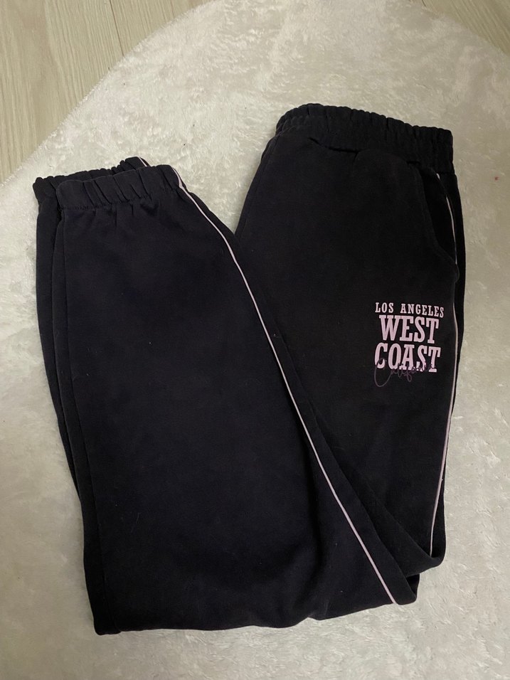 Kadınlar için bol kesim, siyah baskılı ve fermuarlı cepli eşofman altı. Sentetik kumaştan midi boy, günlük rahat sokak stili için uygun.