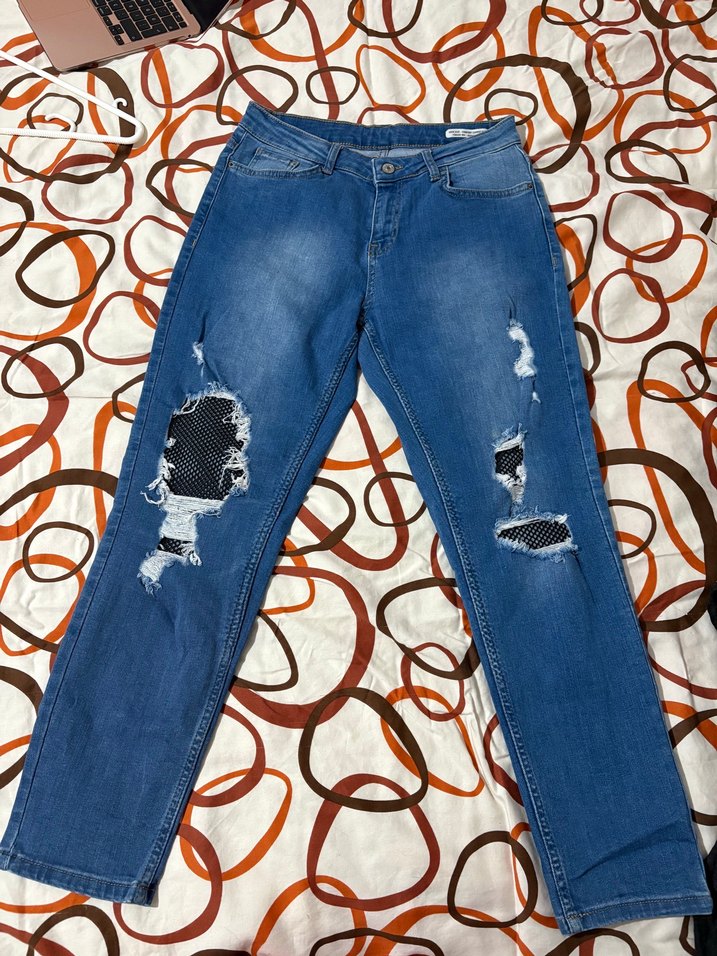 Regular fit mavi denim jean, yırtık detaylarında siyah file kullanılmış. Günlük rahat kullanıma uygun. Sadece bir kez kullanıldı.