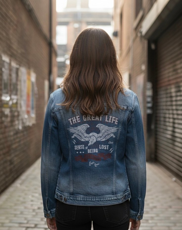 Mavi renkli, bol kesim uzun kollu ve bisiklet yaka denim ceket. Parlak yüzey ve sırtında baskılı desen, tokalı detaylara sahiptir. Günlük kullanıma uygundur.