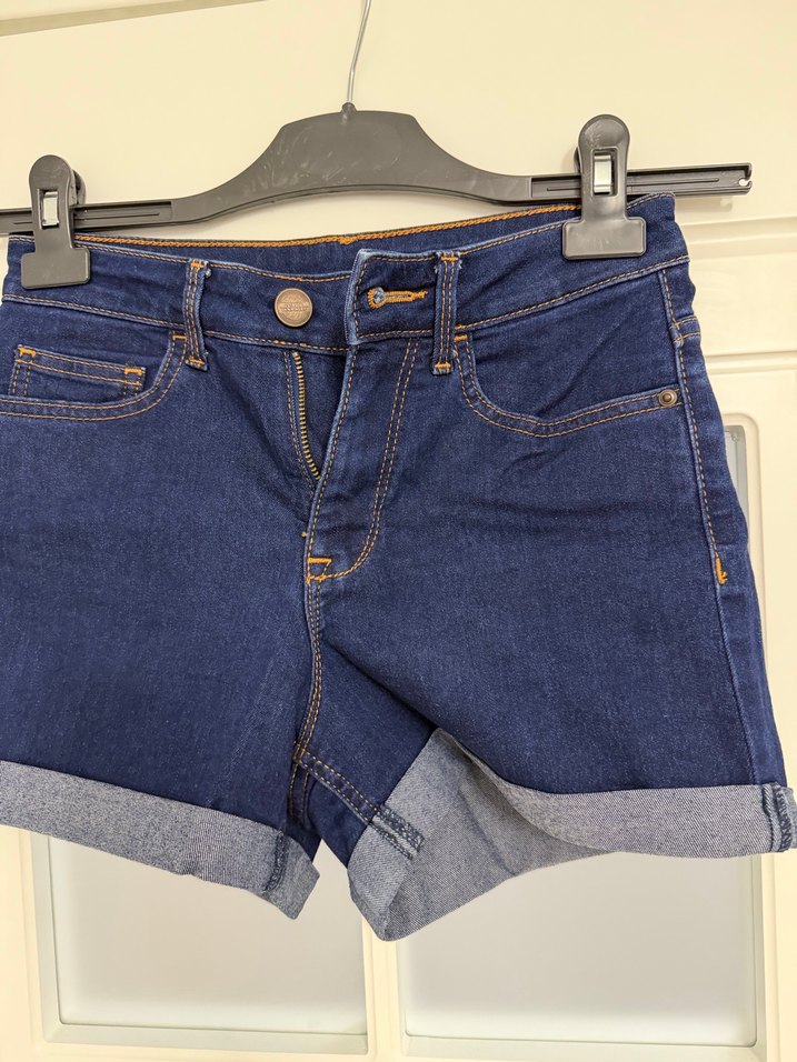 Mavi kot kumaştan yapılmış, sıkı kesim mini şort. Kemer tokası ve kıvrık paça detayı ile günlük rahat kullanıma uygundur.