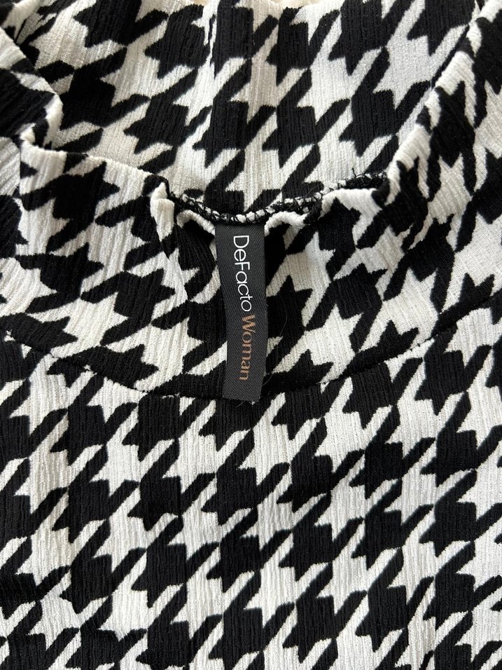 DeFacto imzalı, siyah-beyaz desenli, yüksek yakalı, uzun kollu ve fermuarlı detaylara sahip, midi uzunlukta dar kesim hamile bluz.