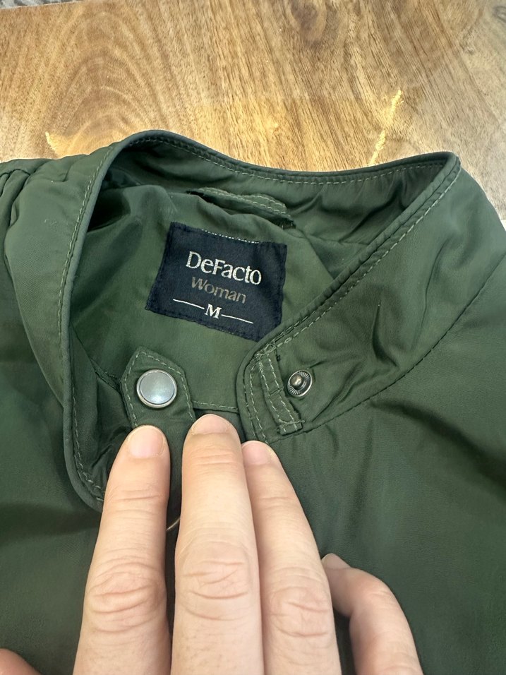 Yeşil DeFacto kadın yağmurluğu, düğmeli,yuvarlak yakalıdır. Parlak dokusu ve rahat kesimiyle günlük sokak stiline uygundur. ☔