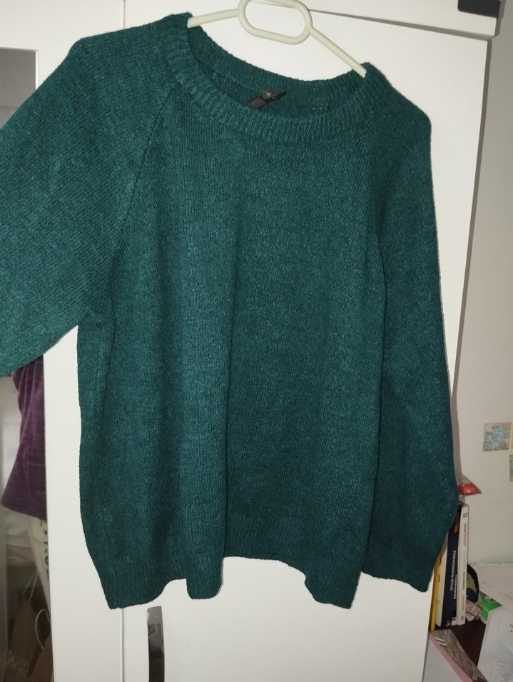 Kadınlar için örgü dokulu, yuvarlak yakalı ve uzun kollu yün kazak. Rahat kesim ve normal boyda, koyu yeşil renkte sade ve desensiz. Günlük kullanıma uygun.
