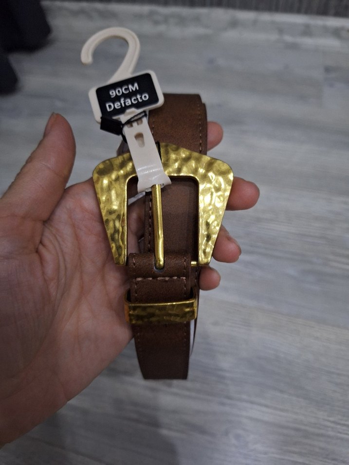 Defacto markalı, 90 cm uzunluğunda, kahverengi kemer. Altın tonlu, dövme görünümlü tokasıyla vintage sokak stili sunar.